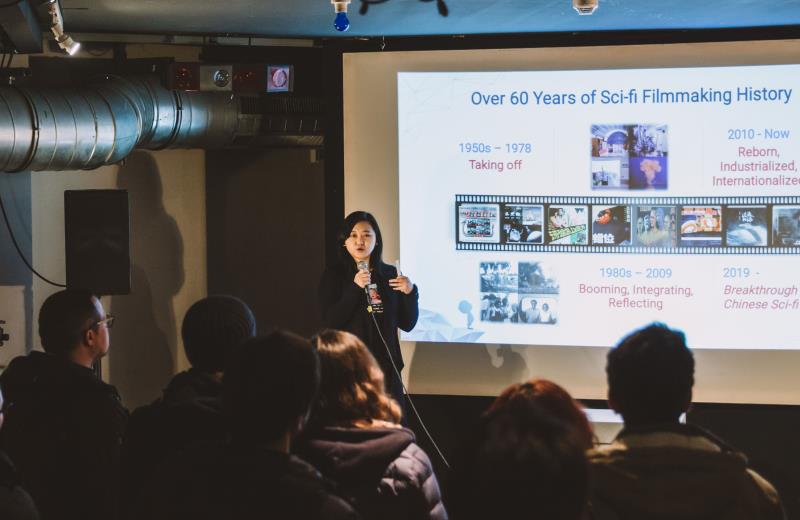 2月23日,一场名为“和‘蓝星球’共同体验科幻”的活动在柏林举行,这是中国“蓝星球科幻电影周”首次海外路演推介活动之一,吸引了大批德国科幻爱好者前来。图为主办方代表王薇在向来宾介绍中国科幻电影的发展历程。