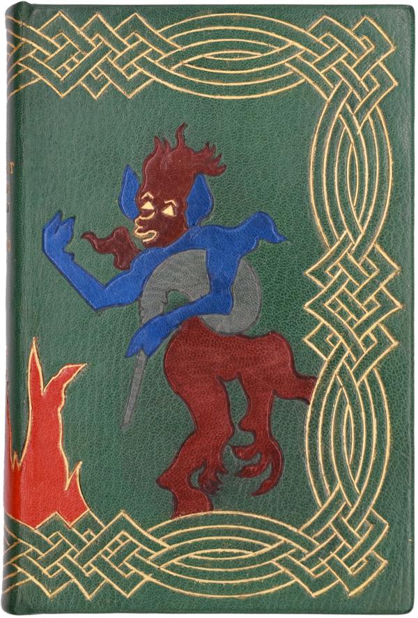 《一个青年艺术家的画像》( A Portrait of the Artist as a Young Man),伦敦:Jonathan Cape Ltd.,1928年六刷(此著初版由伦敦自我主义者出版社于1916年推出)。此册为乔伊斯题赠本,赠言曰:“赠George Cosgrove,詹姆斯·乔伊斯,1929年6月5日,巴黎。”与《尤利西斯》和《芬尼根守灵夜》均推出乔伊斯签名限印版不同,此著乔伊斯签名甚罕见。这是美国著名装帧家重新装帧的作品。绿色哈麦丹山羊皮全皮装。书封的装帧设计灵感来自爱尔兰中世纪手稿里首字母的彩饰图案。烫金印中世纪凯尔特结为边框,框中以彩色镶皮呈现象征冲动的魔鬼和地狱的火焰。包布书匣上是褐色贴皮的都柏林城市天际线。