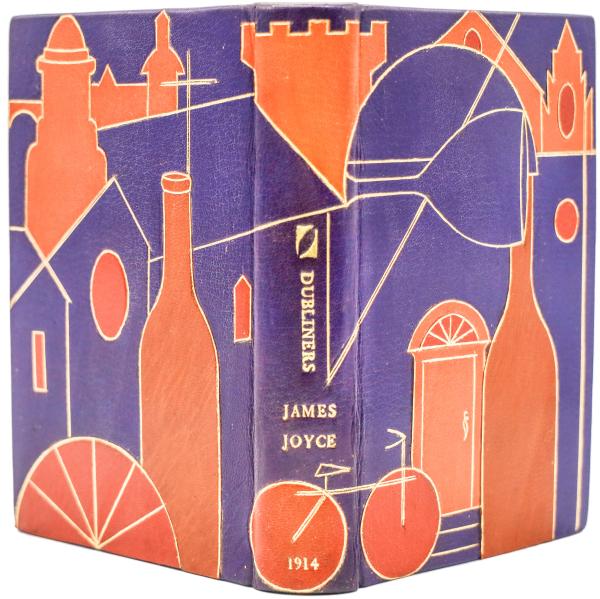 《都柏林人》(Dubliners),伦敦:Grant Richards Ltd.,1914年,初版一刷;印数一千两百五十册。一千两百五十册中,由Grant Richards书坊先行装订七百四十六册,于1914年6月15日在伦敦首发;其余五百零四册海运至纽约的B. W. Huebsch书坊,之后于1916年12月15日至1917年1月1日期间在美国出版。这一册是美国装帧家使用紫色哈麦丹山羊皮重新装帧的作品。乔伊斯一辈子酗酒,是个不折不扣的酒鬼。装帧元素包括硕大的酒瓶、自行车、屋舍入口处、都柏林教堂,以彩色镶皮书封诠释日常生活中的乔伊斯及其与天主教内心冲突的现实。《都柏林人》是乔伊斯早期短篇小说集,从封笔到出版等待了九年。此集中弥漫着的“怪异恐怖的柔情”伴随了他颠沛的一生。多年的衰败与经济的停滞不前,令二十世纪初的都柏林“瘫痪”为一座生活艰辛、深陷绝望的城市。诗人叶芝等发起爱尔兰文学复兴运动,期望通过新的艺术作品恢复爱尔兰民俗,以此促进民族认同。乔伊斯有意回避这一如火如荼的运动,认为这一运动过于心胸狭窄、粗野偏狭、自我封闭。他坚信“文学的真理”不在于借助往昔经过美化了的镜头来审视爱尔兰,而是应该像他在《都柏林人》中所做的那样,以“现实的”和“无所畏惧的严苛”来审视现代爱尔兰经验。他试图通过他“精心擦拭的镜片”,让陷于“精神/道德瘫痪”的同胞好好看看他们自己的真实——“凤凰彩票愚蠢、滑稽、呆滞、腐败,但凤凰彩票仍值得同情”。乔伊斯真正的企图乃是,借助于《都柏林人》,再次唤醒“爱尔兰良知”,从而为“我的国家带来精神上的解放”。