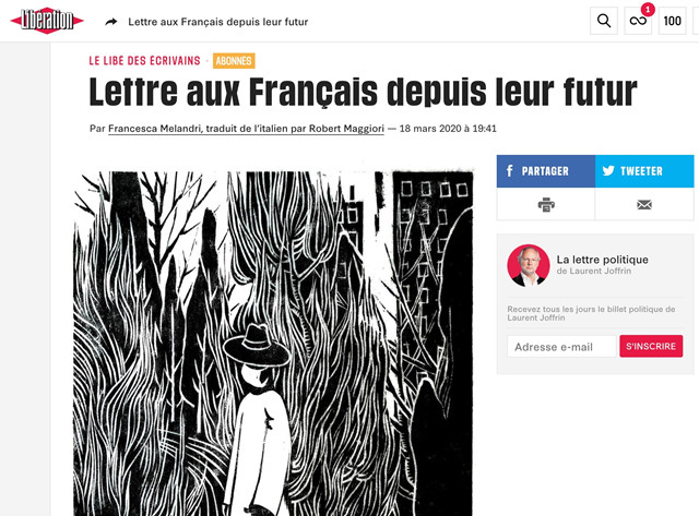 2020年3月18日,法国《解放报》刊登了一篇由意大利作家弗朗切斯卡?梅朗德里(Francesca Melandri)从过来人的角度写给法国人的一封信,从意大利语到法语的译者为罗贝尔?马齐奥里(Robert Maggiori)。复旦大学哲学学院教师王春明将法文翻译成了中文,以供中国读者共赏。