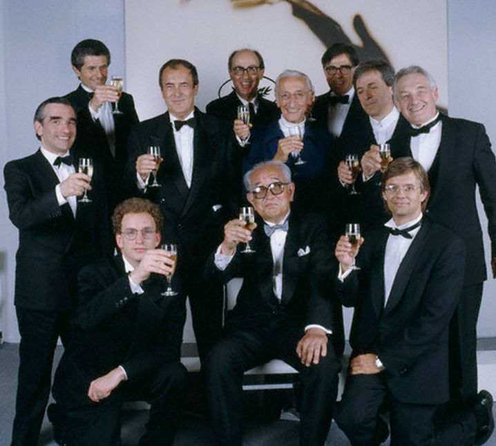 黑泽明(前排中)获得奥斯卡终身成就奖后,诸多知名导演向他表示祝贺。小编认出合影中有马丁·斯科塞斯、伯纳德·贝托鲁奇、史蒂文·索德伯格
