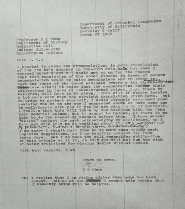 2018年10月,笔者应邀赴斯坦福大学作学术讲座期间,顺访了伯克利大学东亚图书馆,受到多位图书馆研究人员的热情接待。后来经过周欣平馆长批准,东亚馆特别提供了赵元任与外祖父邓嗣禹的九封往来信札,时间从1941-1962年。这些珍贵信札不仅反映两人学术交往的诸多信息,同时还可弥补现已出版的《赵元任全集》和《赵元任年谱》中的不足之处。