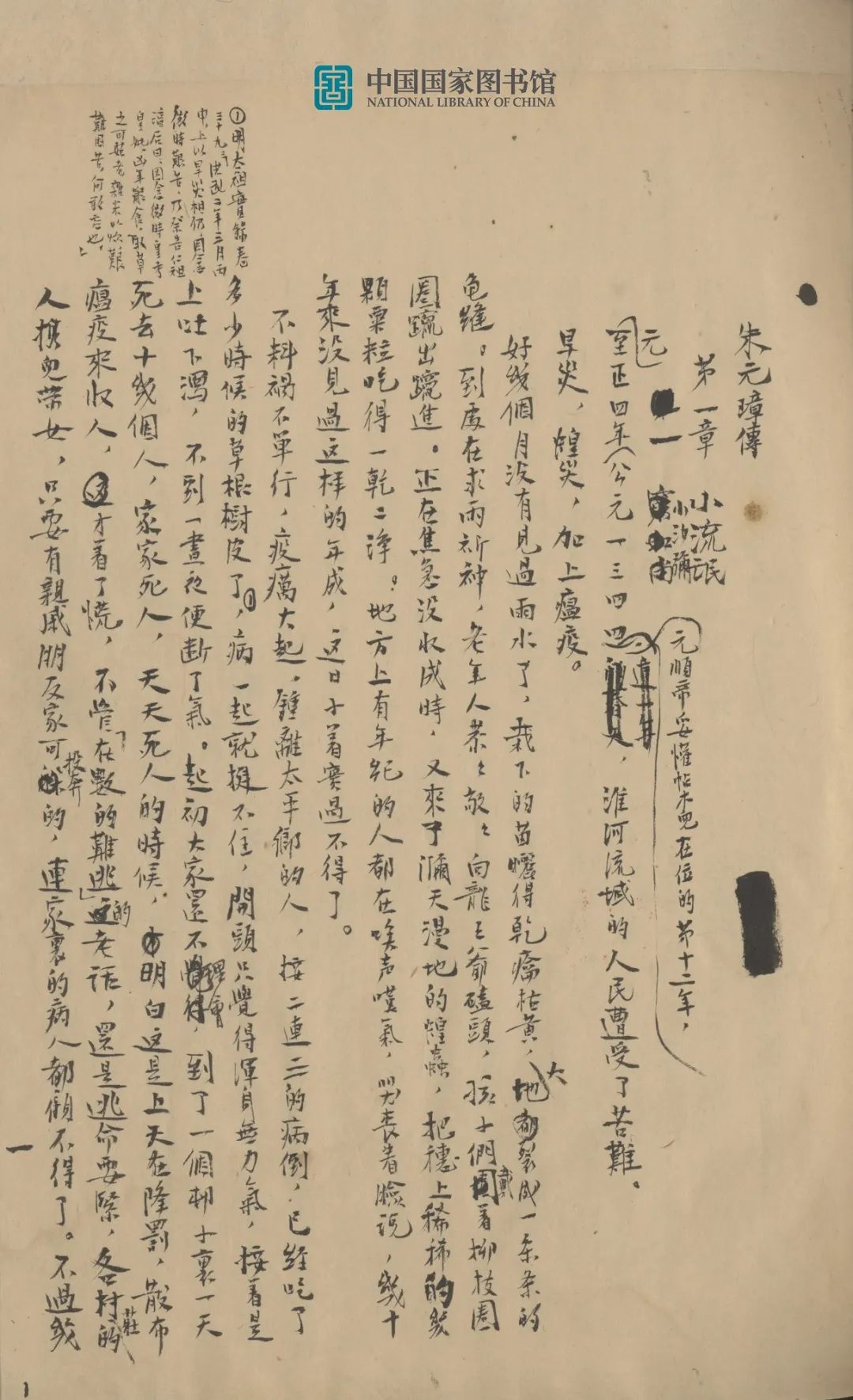 国家图书馆收藏的《朱元璋传》手稿,是1948年写成的版本,1954年吴晗任北京市副市长时亲自捐赠。该手稿为毛笔手书,封面、目录、封底、后记5页,正文136页,共计141页,分四册线装,正文有较多修改。稿件封底有几行钢笔草书,字迹潦草,大意是:一,彭莹玉的下落是消极的、道家的,称赞不当;二,国家机器由军队、法庭、特务机构等组成,而不是由官僚机构和军队组成;三,朱元璋由农民阶级转变为地主阶级,不是由个人的人性物欲决定的,团体利益决定个人利益。其右有吴晗1954年4月1日毛笔手书说明,这则札记写于1948年12月毛泽东与吴晗在西柏坡面谈之时,所记即毛泽东对《朱元璋传》的修改意见。