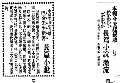 在新文学影响持续发酵的1930年代,《时报》此举一方面体现了其“报界先锋”的地位,大举革新,刊载新文学小说。另一方面,《时报》连载刚刚走向成熟的新文学长篇小说,很明显是含有借新文学作家名声扩大报纸影响力,进而提高报纸销量的用意。《激流》预告中称巴金为“新文坛巨子”,作品不易读到。巴金却否定道:“这明明是吹牛。我当时只出版了两本中篇小说,发表过十几个短篇。文学是什么,我也讲不出来,究竟有没有进入文坛,我自己也说不清楚,哪里来的‘巨子’?”[32]