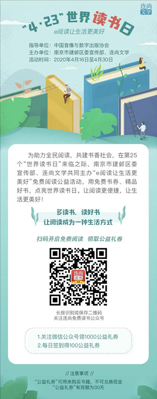 在第25个“世界读书日”即将来临之际,由中国音像与数字出版协会指导,江苏省南京市建邺区委宣传部与连尚文学共同主办的“e阅读让生活更美好”免费阅读公益活动正式启动,该活动也是“2020年中国数字阅读云上大会”系列活动之一。