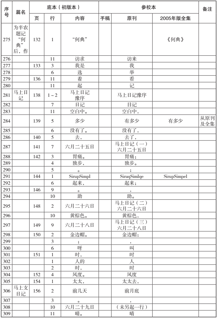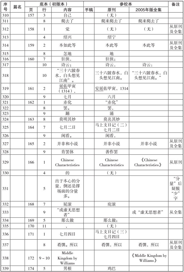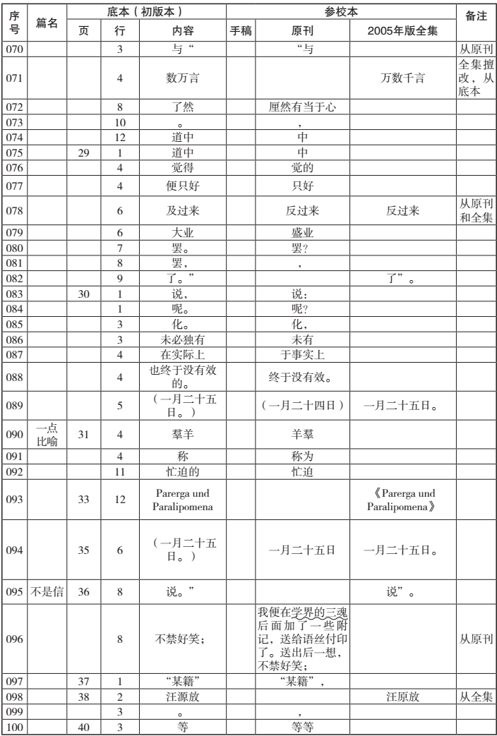 在决定专心从事此项汇校工作之后,因为用于汇校的底本(影印本)、手稿(影印本)与全集笔者早已收藏,因此在资料方面只余下原刊的搜求汇集。得益于近年来旧书刊被大规模扫描和收入网络数据库的利好以及学友的帮助,这项工作在短短几天内即基本完成。[vii]接下来在进行具体汇校时,为了让自己沉下心来,全神贯注,我决定先不参考任何前贤成果,空无依傍,对文本进行“素读”,以保证能最大限度地发现各版的差异之处。由于手稿严重不全,全集差错很少,因此我把重点放在原刊和初版本的对勘上,逐字逐句进行。在对勘过程中发现两者有任何差异,无论是文字还是标点,都及时记录并填入汇校表中。将原刊和初版本对勘完成后,再按同样的程序,将初版本和全集进行对勘。此后,再将手稿和初版本进行对勘。当然,这只是工作的一般程序。实际过程中,遇有疑难处,需要各版互校,也常出现将所有版本摆满案头的情形。