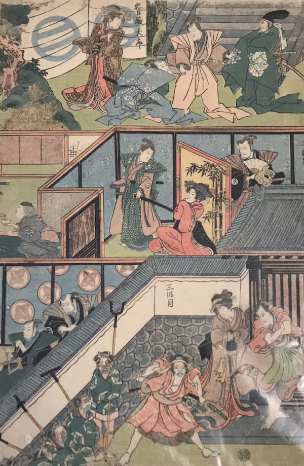 此幅作品取材江户时代武士为主公复仇的故事。图中人物衣着鲜明,眼神互动。场景转换自然。角色开面明朗。