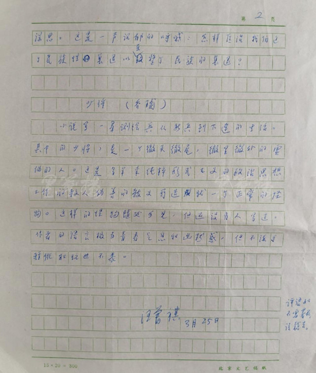 如上文所述,汪曾祺被聘为此次活动评委的时间是1988年11月,那么这个手稿的写作时间就应该是次年即1989年的3月25日了。因为这三则评语的“出土”,今后研究者在重新编撰或修订汪曾祺年谱时就应该补上这一笔才是。