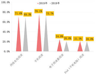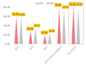 4月20日,中国新闻出版研究院在线发布“第十七次全国国民阅读调查”。调查发现,2019年我国成年国民包括书报刊和数字出版物在内的各种媒介的综合阅读率为81.1%,较2018年的80.8%提升了0.3个百分点。其中,数字化阅读方式(网络在线阅读、手机阅读、电子阅读器阅读、Pad阅读等)的接触率为79.3%,较2018年的76.2%上升了3.1个百分点。