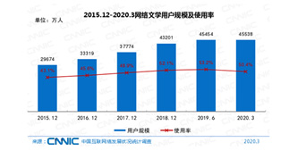 其中,网络文学的发展占据重要地位。截至2020年3月,我国网络文学用户规模达4.55亿,较2018年底增长2337万,占网民整体整体的50.4%;手机网络文学用户规模达4.53亿,较2018年底增长4238万,占手机网民的50.5%。网络文学持续稳定发展,内容品质大步提升,极大地推动了我国数字阅读的发展。