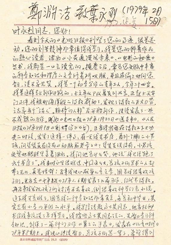 1979年,读者郑渊洁致信叶永烈(图片来源于网络)