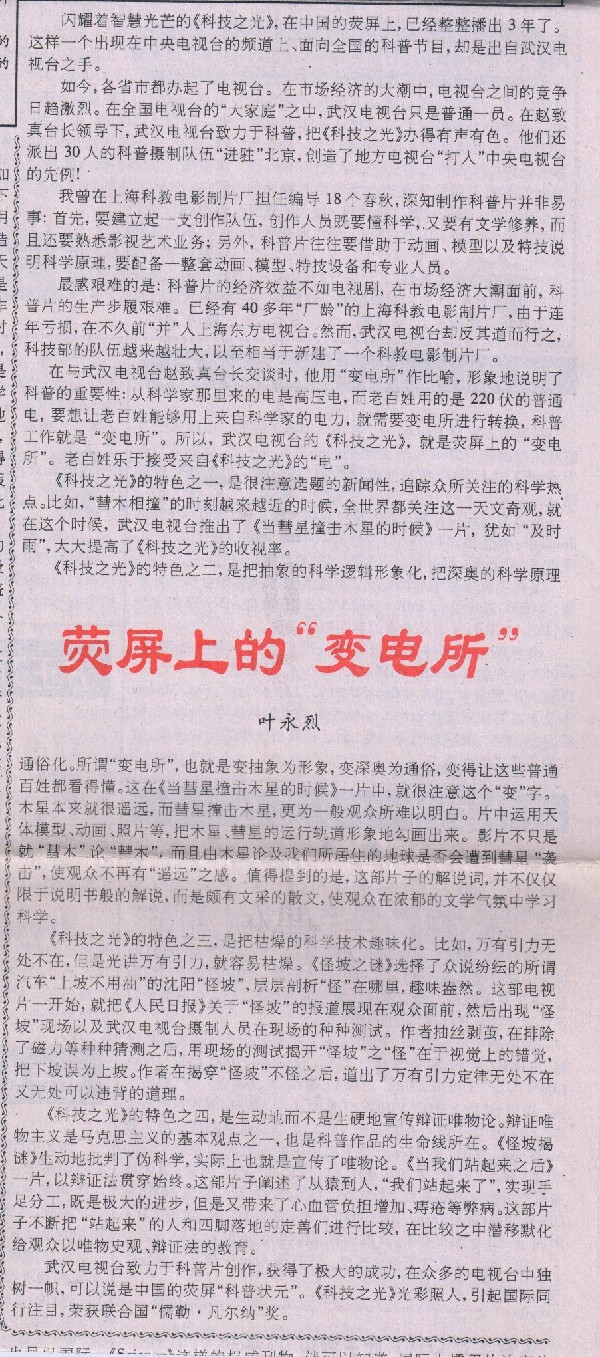 几天后,叶永烈先生如约寄来了他为《科技之光》播出三周年写的文章《荧屏上的“变电所”》,发表在武汉《长江日报》上。叶永烈先生在文中对电视科普的许多见解,今天看来非但不过时,反而更能振聋发聩。他为人善良谦逊、质朴厚道、践诺守信,从这件小事上可见一斑。