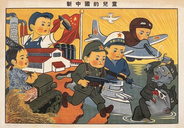 在1949年以来的美术创作中,有很多以儿童为题材的美术作品,其中有很多人们熟悉的儿童游戏。这些不同形式的画曾经在民间有着广泛的影响,并与社会政治和社会发展紧密关联,反映了这一时期儿童题材美术创作的特点。其中以“娃娃戏”的形式来表现的儿童的生活,延续了延安以来的传统。1947年,冯真在延安的“大众美术社”创作了《娃娃戏》《参军》,在当时的印刷量就高达60万份。诞生于革命根据地的《娃娃戏》,不是传统“娃娃戏”中多子多福的寓意,而是有着鲜明的政治主题,是革命机器中的齿轮和螺丝钉。而这种表现儿童模仿戏剧(皮影戏或傀儡戏)的场景,曾经是革命根据地生活中常见的景象,反映了新文化民众宣传的潮流。这种好人与坏人的装扮表演,又类同于当时流行的街头“活报剧”。1950年,张仃创作的《新中国的儿童》,以新中国儿童装扮成海陆空军以及工农的形象,表现了新中国儿童在新社会的政治态度和立场,是这一时期最典型、最有影响的代表作,是延安传统在新中国的发展。