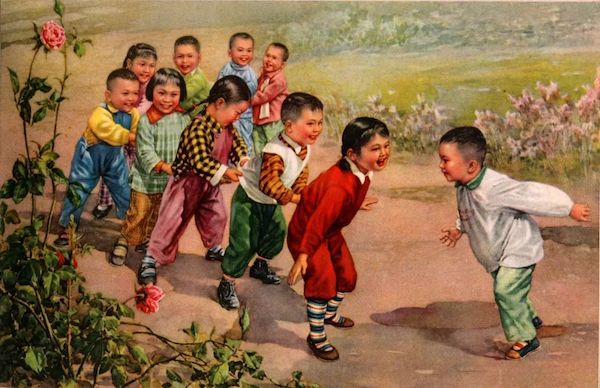 通过儿童题材来表现社会政治,反映新中国新气象的美术作品有很多。黄胄1958 年创作的《办好托儿所 解放妇女劳动力》,是表现新中国新气象的一件特别的作品,也是黄胄一生中比较特殊的作品。“托儿所朋友多,妈妈去生产,阿姨照顾我。”画面中一男一女两个孩子骑在木马上,旁边有簇拥着的托儿所的儿童和阿姨。木马正是当年托儿所、幼儿园中最为普遍的玩具。木马因为有弧形的底座,坐在上面可以前后晃动,能够满足儿童的动的需求,也能够找到骑马的感觉。这种表现托儿所与“妈妈去生产”这样的反映新生活的作品,具有鲜明的时代特点。李慕白于上个世纪的50年代创作的《老鹰捉小鸡》,也是以幼儿园为背景来表现一种最为常见的儿童集体游戏。游戏开始前选出老鹰、鸡妈妈,其他参与的孩子都是小鸡,依次在鸡妈妈后面;“老鹰”通过不停的跑动努力抓鸡妈妈后面的小鸡,而鸡妈妈则张开手臂来保护小鸡不被抓。当老鹰抓到小鸡,就要互换位置,被抓的小鸡则成为老鹰;游戏继续。画面中的孩子们个个露出了灿烂的笑容,显现了时代所要求的新气象。