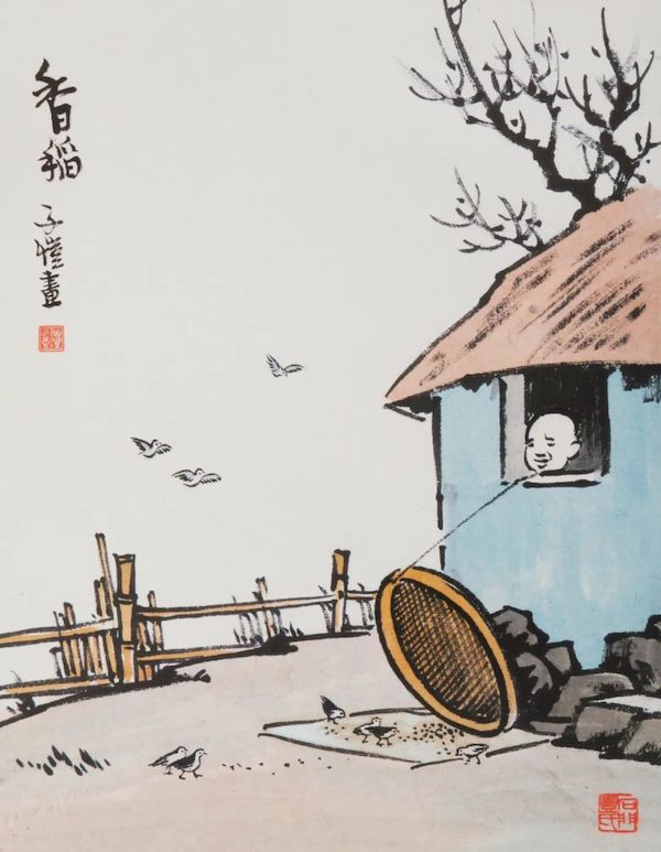 50年代有一段时期的“除四害”,其中的打麻雀是因为麻雀和人争食,而当时的饥饿与粮食问题,是新中国立基的重要问题。以食为天的打麻雀有多种方式,而作为游戏的弹弓则是少数儿童能够掌握的一项技能。魏紫熙1956年创作的《神射手》像肖像画一样,表现了儿童玩弹弓的形象,所不同的是这里不 是一般意义上的“玩”,而是关联着打麻雀的社会政治背景。丰子恺的《香稻》是另一种形式的捉麻雀,画面中的儿童在窗外撒上了一些稻谷,上面支上了竹筐,支竹筐的杆子上系了绳子,并连接到窗内。儿童探出头来窥视,只待麻雀走进筐内就拉掉杆子,活捉麻雀。相同题材的还有李桦1955年的木刻《抓麻雀》;而在1956年的国画中还有钱松喦《捕雀》,唐云《捕雀图》,赵延年、唐云的《捕雀图》等。尽管这种与动物的关系发生在过去的那个时代,可是,儿童对于动物的兴趣也是那个时期的平常。这种活捉麻雀的方式一般都在冬季,因为这个时候的麻雀觅食困难。依然是在冬天,丰子恺的《瑞雪映睛空儿童塑雪翁》(1961 年)表现的是雪后儿童堆雪人的场景,而萧淑芳笔下的儿童滚雪球,也是在冬天雪后常见的儿童游戏。不管是滚雪球,还是堆雪人,直到今天都是儿童们的最爱。