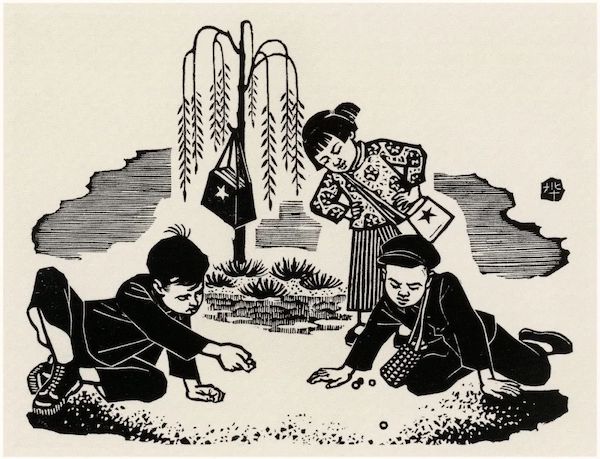 打弹子的游戏经常出现在放学之后,李桦1960 年创作的《放学后》,所表现的打弹子的游戏是一种一年四季都能玩的最为普及的游戏,只不过那时候儿童要得到一枚心仪的弹子也不容易。弹子是玻璃做成的彩花弹,有“独花弹”,也有“三花弹”,属于“彩花弹”;还有“水晶弹”,而“奶油弹”较少。物以稀为贵,“奶油弹”为上品,“水晶弹”次之,“彩花弹”最为平常。打弹子的游戏种类较多,各地玩法也不尽相同,但是,“打”的方式大致相同。画面中的孩子在放学后把书包挂在树上,在地上打弹子的两个孩子的神情是李桦的精心所在,其专注和认真吸引了后面观看的女同学。李桦带有装饰性的艺术语言,生动地表现了儿童的天性,而这与当时其他表现放学后参加劳动的作品有很大的不同,也是当时的一种现实。