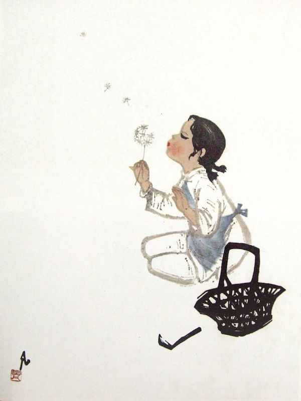吴凡于1959 年创作的版画《蒲公英》,是新中国儿童题材美术创作的代表作,也是表现儿童在学习和劳动之外的玩乐题材的代表作。《蒲公英》是一种生活中的平常所见。一位身边有小筐和镰刀的小女孩,在劳动休息的时候吹蒲公英,自然而生动,富有生活情趣。可以说,这是和平年代中的轻歌小调,浅吟低唱。该画在1959年莱比锡国际书籍艺术展览会的版画比赛中获得金质奖章,不仅为新中国赢得了荣誉,也让人们看到了没有政治主题的创作仍然可以表现出时代的意义。