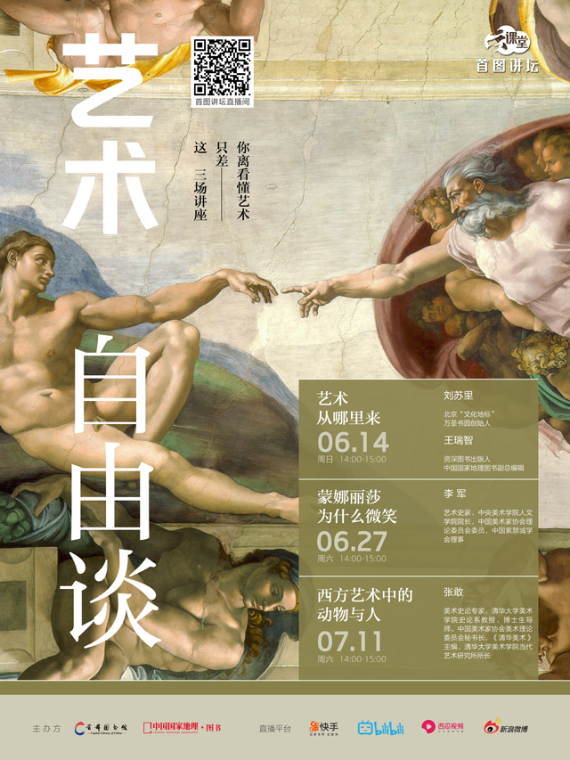 “艺术自由谈”系列讲座由北京万圣书园创始人刘苏里、“中国国家地理?图书”副总编辑王瑞智、中央美术学院人文学院院长李军、清华大学美术学院史论系教授张敢等文化艺术领域知名专家主讲,从奈杰尔?斯皮维的《艺术创世记》、达?芬奇的《蒙娜丽莎》、肯尼斯?克拉克爵士的《动物与人》等作品入手,分析人类文明与艺术之间的复杂关系。系列讲座包括《艺术从哪里来》《蒙娜丽莎为什么微笑》《西方艺术中的动物与人》三场,将从美学、艺术史、人文学等角度剖析世界知名艺术品,引领读者走进艺术的美好世界。