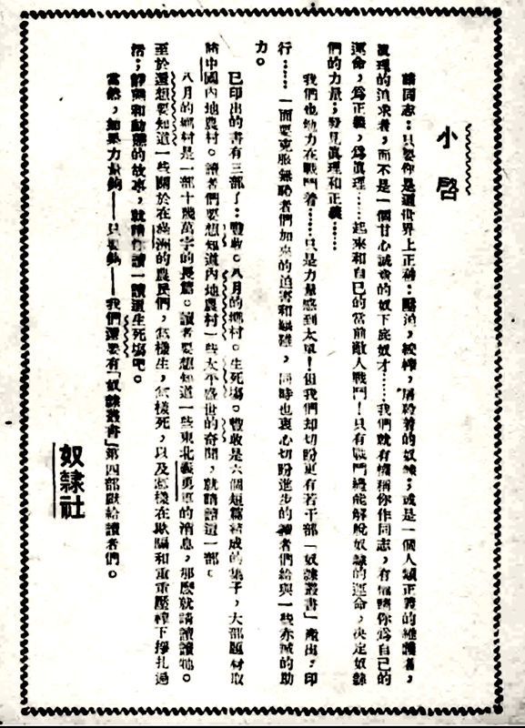 容光书局版《生死场》附页奴隶社《小启》