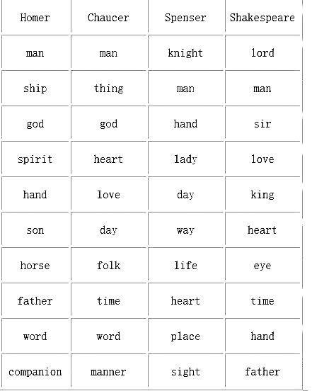 通过这样的表格可以发现,荷马、乔叟、斯宾塞、莎士比亚的风格与他们所处时代的变迁得到了一种独特的呈现,通过主题词的变迁,凤凰彩票能够窥见不同时代的文学主题与不同作家的文本主题,达成对一位作家语言无意识的理解。就名词而言,在莎士比亚的所有文本中,爱是出场率第四高的名词,只有主(lord)、人(man)和先生(sir)三个词出场率高于爱,而其他三位作家所使用的最高频名词则没有爱(love),无论莎士比亚是伟大的爱情讴歌者,还是伟大的爱情质疑者,爱都是其一个重要表现和反思主题。