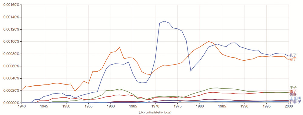 谷歌是人工智能领域的领头羊,而谷歌图书中收录的大量书籍,谷歌搜索中存在的大量网页文字数据,以及谷歌学术中的学术文字记录,都为构建这样一个庞大的语料库有所助益。它出品的在线工具“Google Ngram viewer”主要基于谷歌图书的语料库,方便展现不同语词在历史上的整体变化。通过输入想要查找的关键词,便可以看到在相关语料中,随着历史发展,相关词语的变化趋势。例如,笔者将时间限定为1940-2000年,键入孔子、孟子、老子、庄子、朱熹等中国历代思想家,可以发现,它们历年在数据库中的权重变化,这一数据显示,孔子无疑是最有热度的思想家,与学者和相关论者的思想勾连也最为密切。