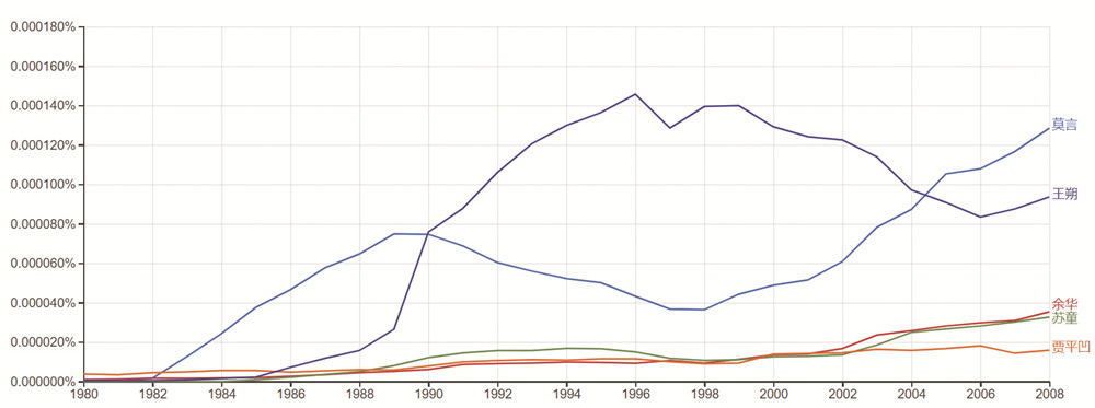 再如,可以选取几位当代作家,如莫言、余华、王朔,观察自1980年代以来,在纸质书数据库中他们的权重走势。