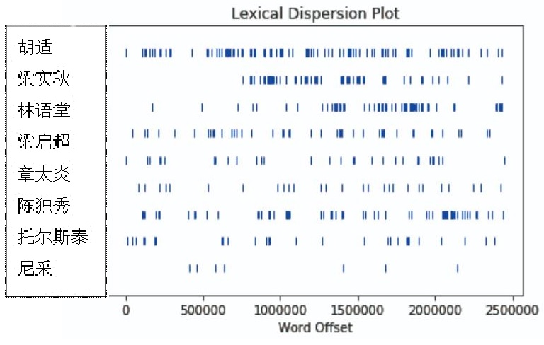 同样,也可用它对中文文本进行研究,例如,某些特定的人名在作家鲁迅的文本中的分布状况如何呢?笔者采用python中的nltk模块绘制了如下分布图。