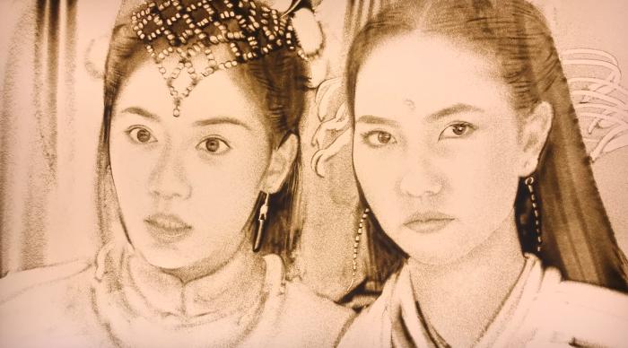 沙画重现苏有朋版《倚天屠龙记》中的赵敏和周芷若。受访者供图