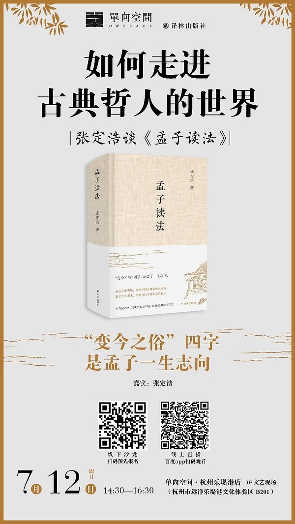 7月12日,张定浩带着他的新书来到杭州,做客单向空间·杭州乐堤港店,与读者分享自己对《孟子》及孟子其人的认识。张定浩说,《孟子读法》出版后一直未在上海做活动,此次特地在杭州举办第一场分享活动再次说明了他与杭州的缘分,早在《孟子读法》之前,张定浩已经写过一本叫“孟子选读”的小书,这本书正是由杭州出版社出版的。