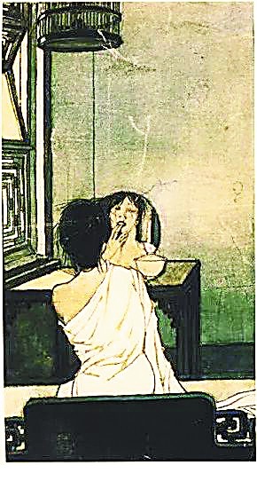 闻一多除了擅长书籍封面设计外,亦精于书刊的插图设计。1927年,他为潘光旦的书稿《冯小青考》(后改名为《小青之分析》《冯小青:一件影恋之研究》),创作了一幅名为《对镜》的水彩画插图。冯小青是生活在明代万历年间的一位才貌双全的女子,因婚姻不幸最终抑郁而死。画面上,闻一多借鉴19世纪末西方新美术主义设计风格,勾勒了主人公身披睡衣、以背示人、对镜梳妆的背影,同时巧妙地借助梳妆台上的圆镜,映衬出她散乱的发鬓间,娥眉微蹙,眼神忧悒,面容憔悴的形象。画面的左上方,悬挂着一只鸟笼,预示了人物的悲剧命运。整幅作品从一个侧面,折射了闻一多积极倡导并身体力行的“中西会通,古今融合”的美学理念。