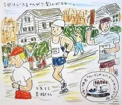 真不知道是一本正经还是嘲讽。总之,水丸在文章中写道:“那之后,箭头确实成了我强有力的伙伴。画上箭头标上名字,再没什么好怕的。”水丸画笔下的跑者村上
