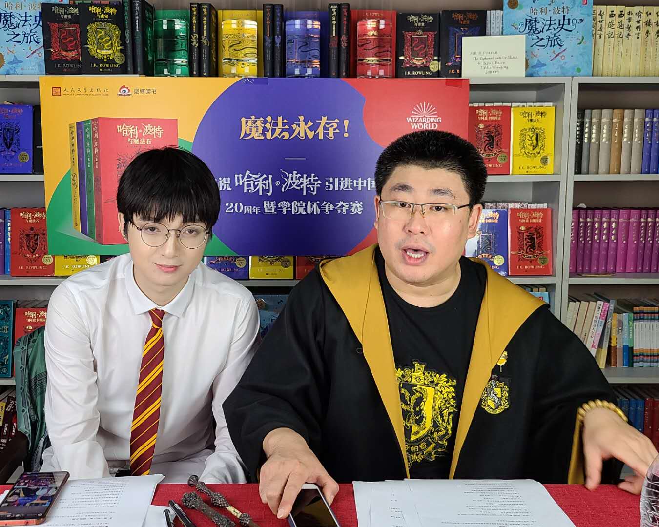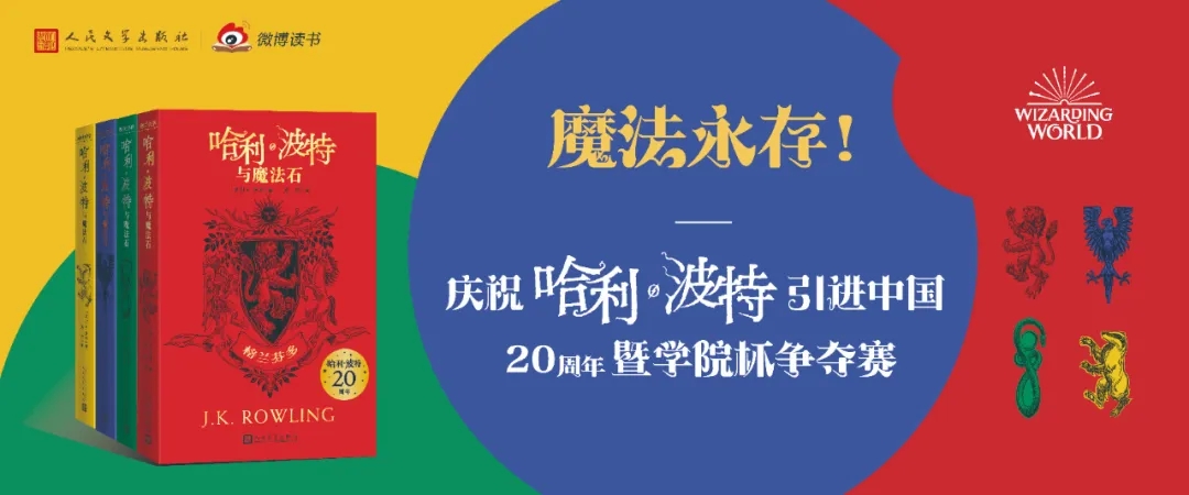 7月31日,即哈利?波特与该系列小说作者J.K.罗琳生日当天,由人民文学出版社联合网易举办的“魔法永存——庆祝‘哈利?波特’引进中国20周年暨学院杯争夺赛”活动通过微博平台举行,在线观看“哈迷”超过90万。中国出版传媒股份有限公司董事、总经理李岩和人民文学出版社社长臧永清分别致辞,“哈利?波特”系列图书的责任编辑王瑞琴、马博和译者马爱农与数十万“哈迷”亲密互动,分享20年间读书感悟。活动由青年评书演员郭鹤鸣主持。
