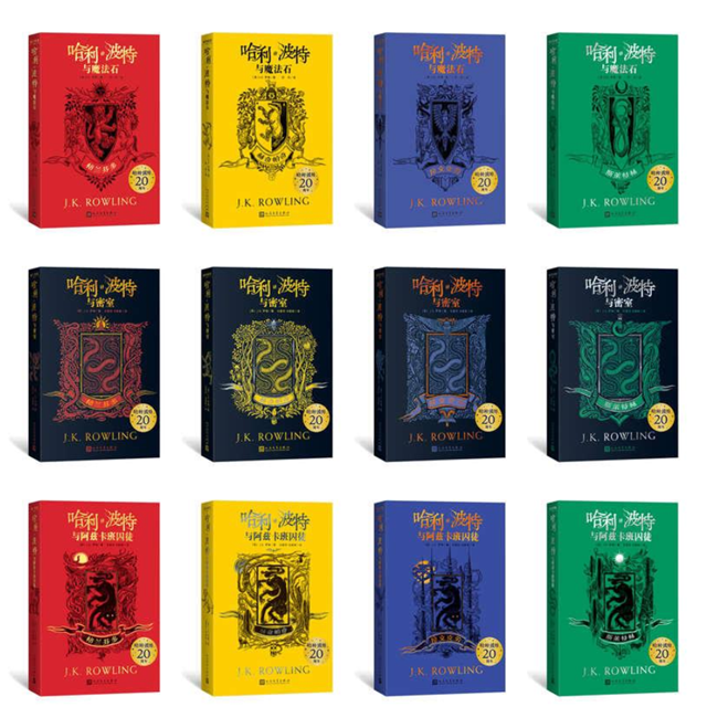 在“哈利?波特”系列图书引进中国20周年之际,由人民文学出版社出版的“哈利?波特”学院纪念版上市。学院纪念版基于读者热爱的学院概念来庆祝这部20年来魅力不减的作品。该版本将同样的故事推出格兰芬多、斯莱特林、赫奇帕奇和拉文克劳四个学院版本。四个版本共同拥有最新修订的译文,完整收录了小说内容。而与此前故事的不同之处在于:每本书都根据自己的学院增加了大量相应的全新内容,如学院创始人、著名学生、知名校友、院长、学院幽灵的简介等等。此外,装帧是此版本区别于其他版本“哈利?波特”的另一亮点,这本书完整复制了英国学院版的工艺,不仅全部使用触感膜封面加以烫金、UV、起鼓等工艺,每个学院的书口更是刷上了标志性的学院配色。