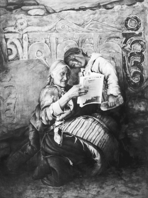 “从专业上来说,这幅画题材不够独特,但这个画面于我而言意义重大,我就想记下那个打动我的珍贵瞬间。”画中,一位老牧民手捧一本书眯着眼睛细细端详,孙女倚靠在旁好奇地看着,这位牧民正是格桑旺堆的妻子,而她手里的这本书就是《西藏最后的驮队》。