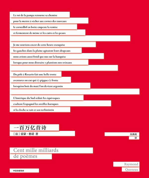 法国作家雷蒙·格诺(Raymond Queneau)的实验文学作品《一百万亿首诗》(法语:Cent Mille Milliards de Poèmes)于今年三月由中信出版集团译介出版。这部作品由十首十四行诗构成。十首诗除严格遵循经典十四行诗的格律和规范外,各首诗的同一行还遵循相同的押韵。在作品的成书形式上,十首诗都单面排印,各行之间被剪开,左侧装订。在此押韵方式和书籍刊印形式之上,阅读此书变成了一种数学组合游戏:每一首诗的任意一行,不仅存在于本首诗之中,还可以与其他九首诗中除本行外的各行组合起来构成一首新诗。这种组合的数量是十的十四次方,即一百万亿。换句话说,这十首十四行诗最终可以组成一百万亿首诗。按照作者在作品使用说明中的计算,一个人一刻不停地阅读,读完这一百万亿首诗需要花费大约一亿九千万年。