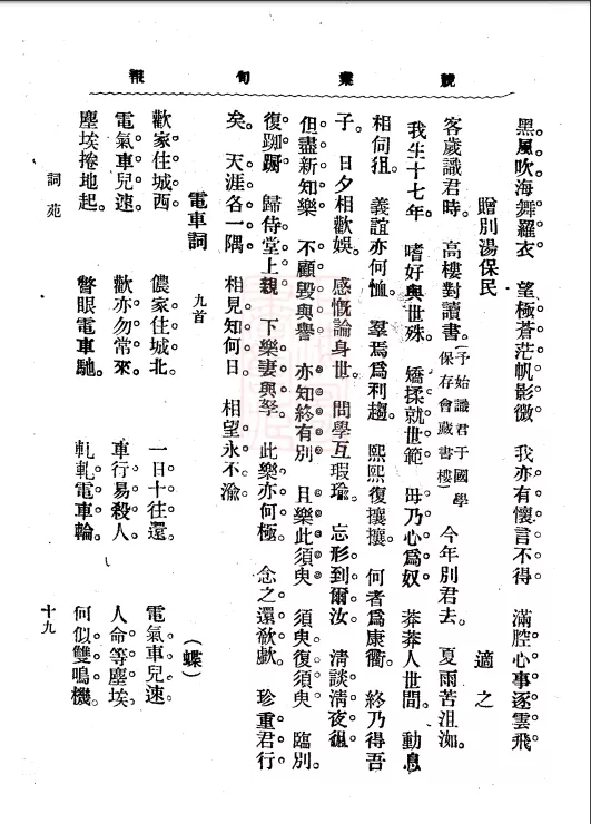 电气车是上海都市中出现的现代事物。《格致新报》上曾经介绍电气车的速度,在平直之处,每分钟能走七里。它的速度要远远快于马车和人力车,但人们对电气车的谴责之声非常激烈。因为电气车常常撞人,轻则受伤,重则身亡。《通学报》上的《电车碾人》就登载过上海法租界电车在八仙桥西碾死王龚氏母子二人的消息。甚至有人估计,上海电车通行数月,“碾死者相望,夷伤者不可胜计”。这自然有些夸张,但电车撞人事件肯定引起了人们的担忧。《竞业旬报》上刊载有两首谴责电车的诗,分别是德争的《哀电车》,和胡适(署名“蝶”)的《电车词》。胡适的《电车词》采用乐府体,以女子劝情郎少来见面的担忧,突出电车的危险,“十里电车道,步步有危机”。德争的《哀电车》则采用骚体,用众多比喻极写电车的速度之快,因而撞人也快,从而有些悲愤地谴责其无情。从美学风格来看,《电车词》趋俗,《哀电车》近雅。但两者在篇幅上都有一定的规模,不止四句、八句那样短小。