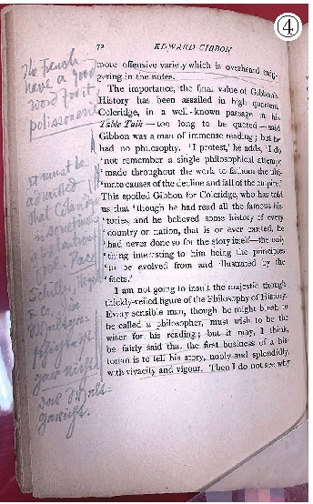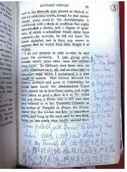 译文:即便是在威廉·汉密尔顿的时代,牛津也是学问的低谷(见《论丛》)。牛津的衰败迹象或许开始于布鲁诺(“真正科学之遗孀”),目前停留在这卑微的我自身了。(中文诗略)但是那些“沉闷的”剑桥“珍禽异兽”(借用格雷之语),相较于牛津而言,确实也不过彼此彼此了吧。