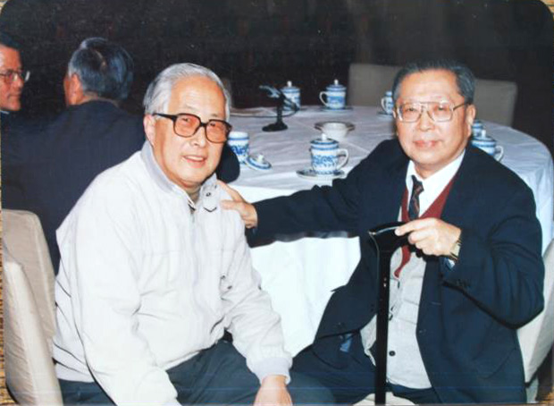 华君武(左)与曹禺 邹士方 摄(1989年春节)