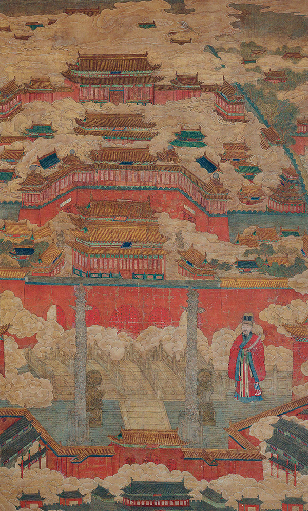 下面的这件台北故宫博物院藏(展出的为复制品)的明代晚期的《入跸图》也详细地描绘了明代的宫殿的建构。