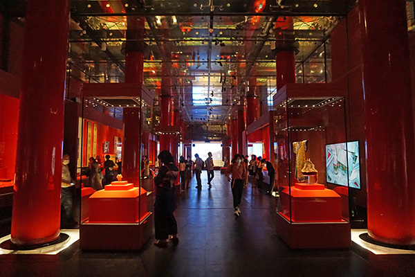故宫午门正楼展厅主题为“有容乃大”,空间色彩采用红色,烘托出清代紫禁城宫殿建筑及内檐装饰的华丽与精美,同时讲述清代各个时期紫禁城建筑格局与风格的变化。