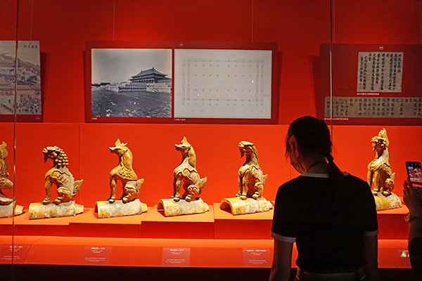 如紫禁城里著名的屋脊兽也从屋脊上搬到了展厅,这套小兽是康熙三十四年重建太和殿时的原件,每件小兽都有美好的象征寓意,尤其是最后一件——行什,只在太和殿出现,是个孤例,也是太和殿建筑无上等级的体现。太和殿初建时名为奉天殿,后多次烧毁。康熙十八年(1679)二月初三日再次焚毁,由于良材难求,取木艰辛,这次工程备料用了十余年;直到康熙三十四年开工,两年后告竣,才有了今日的形制。”