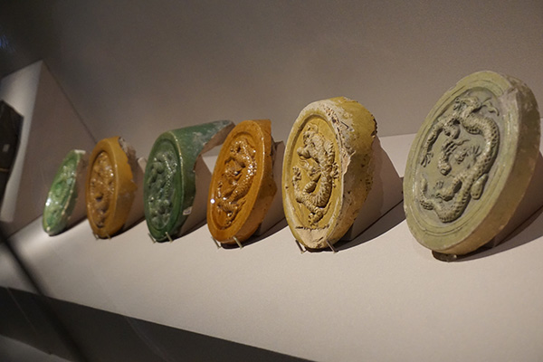明代保存至今的琉璃瓦的部件,如下面的凤纹、龙纹滴水,各种颜色的琉璃龙纹勾头依旧上的龙、凤纹雕花依旧清晰,且颜色褪去以后,别有一种不同于今天琉璃瓦部件的古朴。琉璃瓦的部件