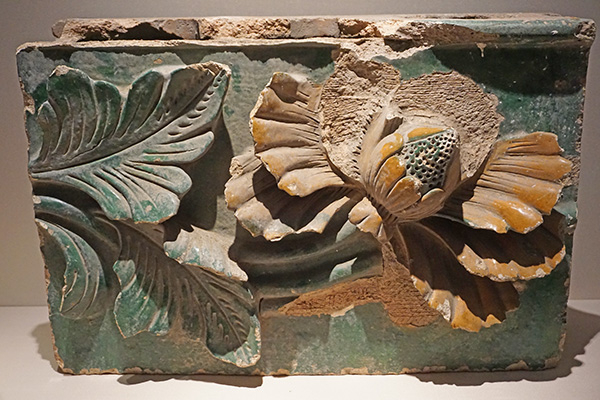 下面的这件黄绿琉璃塑莲花瓦件由南京博物院藏,虽然只是建筑的一个组成部分,但是莲花的叶片和荷叶以浮雕的方式从平面上涌起,蓬勃美丽。黄绿琉璃塑莲花瓦件