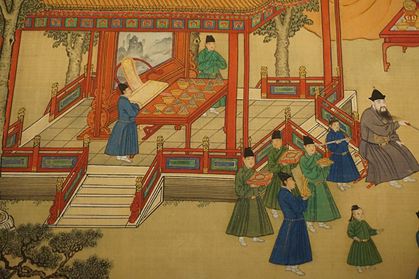 乾东五所与乾西五所,在明代是供地位较高的宫女居住的地方。明代宫女中未能升为嫔妃,但资格较老、地位较高者,得以居住在乾东或乾西五所。皇帝的乳母,是最高等级的宫廷女佣,例行居住在这一带。乾东、乾西五所,明清两朝也常有公主居住,清代也曾成为皇子的居所。现场也展出了多幅描绘明代的皇帝在后宫中生活场景的绘画,明代宫廷绘画中有一类表现帝王生活和重大历史事件的作品。《朱瞻基行乐图》描绘的就是明宣宗朱瞻基便服簷帽在御园观赏各种体育竞技表演的场面。包括射箭、蹴踘、马球、捶丸、投壶等,场面宏大繁复而又具体入微,生动地表现出当时宫中的文体娱乐活动。由于要反映特定的地点和环境,所以描绘了大量的建筑。此卷以工整细腻的写实手法按照历史原貌对明代皇宫的楼台殿阁作了既真实又概括的描绘,是研究明代宫廷历史以及皇家建筑的重要资料。