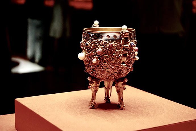 以下为故宫博物院藏清乾隆金嵌宝金瓯永固杯,杯金质,鼎式,圆形,直口;口沿錾回纹一周,一面中部錾篆书“金瓯永固”,一面錾“乾隆年制”四字款;外壁满錾宝相花,花蕊以珍珠及红、蓝宝石为主;两侧各有一变形龙耳,龙头上有珠;三足皆为象首式,象耳略小,长牙卷鼻,额顶及双目间亦嵌珠宝。每年的元旦子夜,皇帝会用此杯于养心殿饮用屠苏酒,然后书写开笔吉祥语。