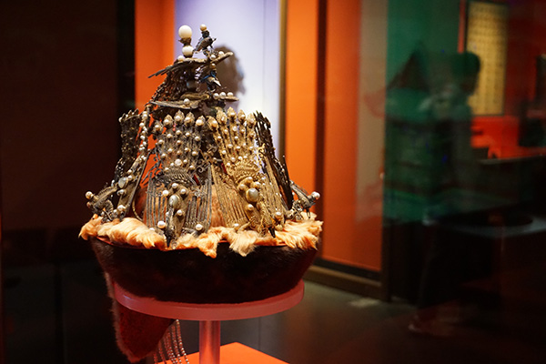 紫禁城里最热闹的就是有喜事的时候了,现场也展出了最高规格的婚庆场景——清代皇帝大婚时的配置:貂皮金凤嵌珠宝皇后冬朝冠