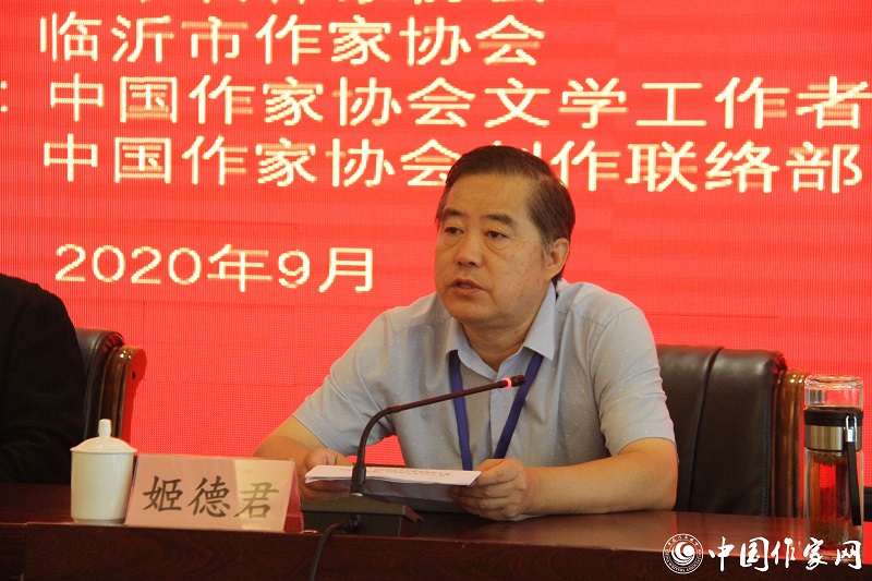 姬德君在致辞中回顾了山东的文化历史传统以及山东文学在中国文学发展进程中的重要作用。姬徳君表示,今年是山东文学事业在新世纪取得新成就的关键之年,此次“到人民中去”职业道德教育与文学社会服务实践活动在山东临沂举办,对山东作协、山东广大作家和文学工作者们而言是一次难得的学习交流机会。山东作协将立足山东文学实际情况,引导广大作家和文学工作者进一步提高职业道德素养,深入开展“深入生活,扎根人民”主题实践活动,加强文学队伍建设,积极开展文学社会公益服务活动。同时他希望山东作家坚持以“人民为中心”的创作原则,深入生活,潜心学习,创作出一批反映时代主题又具有齐鲁特色的优秀作品,为繁荣发展山东文学贡献力量。