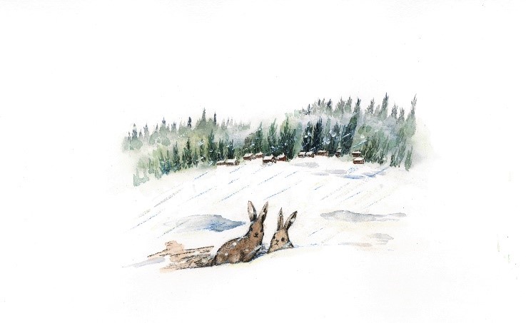 画中还有两个我必须提到的意象。第一个是 “提水站”,东北田地里最常见的小型建筑。东北的春天雨水不多,在田地里建个提水站为了方便灌溉。这种实用的小建筑通常是红红的房顶、白白的墙体。当田野慢慢变绿,一排一排的“红房顶”无疑是春天里最亮眼的颜色。有一幅画中出现了“红房顶”,细心的读者一定能发现。另一个是“冬天”。任何地方的冬天都取代不了东北的冬天。作为东北人,对冬天的情感是熟悉且自豪,寒冷又温暖。其中的“雾天”是我个人最喜欢的一幅。野兔兄弟出逃,在雾天走丢。当雾终于散开,紧张又向往的心情浮现在两只野兔的脸上——它们的背后是陌生的村庄,雪地很凉,村庄很暖,村庄后是一大片茂密的松树。几年前的初冬,我去过大兴安岭,置身松林的体验为我创作这幅画提供了很多灵感。当时我穿越大兴安岭,茂密的松林向后移动,车窗外的雪花簌簌地往后飞。降雪让地面变滑,松林被风吹得哗哗响,令我紧张又向往。