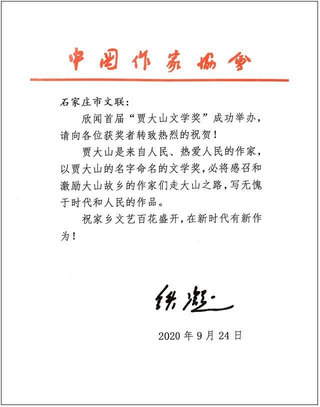 铁凝在贺信中说:欣闻首届“贾大山文学奖”成功举办,请向各位获奖者转致热烈的祝贺!贾大山是来自人民、热爱人民的作家,以贾大山的名字命名的文学奖,必将感召和激励大山故乡的作家们走大山之路,写无愧于时代和人民的作品。祝家乡文艺百花盛开,在新时代有新作为!