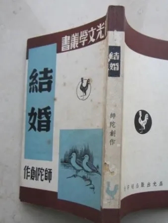 之后的“晨光文学丛书”也延用了这一样式,同样为人称道。如师陀的《结婚》,淡蓝色和铁红二色搭配,上下各涂一同宽的铁红色条,左侧为一纵向的蓝色块,上嵌人二分之一铁红色条内,下置全书三分之二略多处,书名“结婚”用黑色的美术字印于蓝色块内,右下三分之一处为一蓝色正方形,中画一对鸯鸯,象征全书寓意。由于淡蓝色底与黑色书名对比鲜明,《结婚》的书名便显得极为醒目,仿佛跳入读者的眼睛,令人爱不释手。而这种条块与图画相搭配并契合全书寓意的构思模式,也成为“晨光文学丛书”的招牌样式。